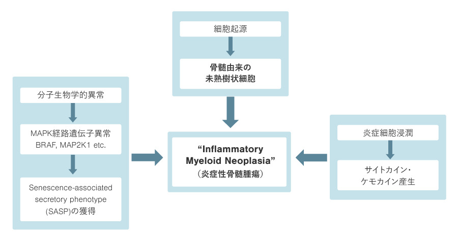 ランゲルハンス細胞組織球症(Langerhans cell histiocytosis:LCH)は、単球・マクロファージ・樹状細胞に由来する細胞が全身に集簇する組織球症(Histiocytosis)の中で最多の疾患である。LCHという疾患名は1980年代になり初めて登場したものであり、それまでは「好酸球性肉芽腫症(eosinophilic granuloma: EG)」「Hand-Schüller-Christian病(HSC)」「Letterer-Siwe病(LS)」、あるいは「Histiocytosi X」という疾患名が用いられてきた。現在では、LCHの細胞起源は、骨髄中の未熟樹状細胞であることが明らかとなっている。さらに、BRAF V600EなどのMAPK経路遺伝子異常とそれに伴うoncogene-induced senescenceによる組織へのLCH細胞の集簇と炎症細胞によるサイトカイン・ケモカイン産生による組織破壊の2つの特徴を有しており、現在では「炎症性骨髄 腫瘍”Inflammatory myeloid neoplasm”」として認識されている(図1:LCHの病態)