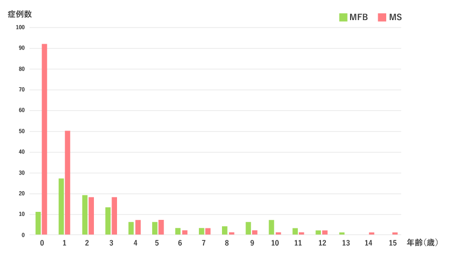 国内においては年間約100例の発症が認められ、2歳以下の乳幼児に好発する疾患であるが、成人から高齢者を含めたあらゆる世代に発症する(全体の約20-30%は成人例である)。LCHは病変の存在する臓器の数と場所によって単一臓器型と多臓器型に分けられる。乳幼児では多臓器型が多い傾向が認められ、単一病変型は幅広い年齢層に発生し、骨病変は年長児に多い傾向がある(図2:JLSG-96/02試験に登録された小児LCHの病型と年齢の関係)。