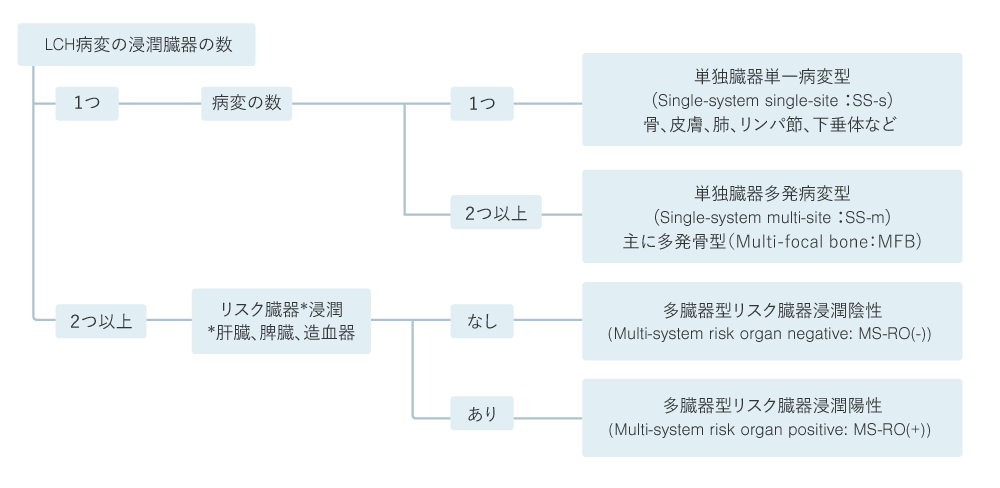 LCHの病型はLCHが浸潤する臓器の数と場所によって分類される。LCHは病型ごとに自然経過が異なるため病型の確定は非常に重要である。まずは浸潤する臓器が、「単一」あるいは「複数」によって1臓器にのみ病変が限局した単独臓器型(Single-system型: SS 型)と2つ以上の臓器に浸潤を認める多臓器型(Multi-system型:MS型)に分類される。単独臓器型は病変が1か所のみの単独臓器単一病変型(Single-system single-site 型:SS-s型)と、病変が多発している単独臓器多発病変型(Single-system multi-site 型:SS-m型)に分類され、2つ以上の骨に病変を有するものは特に多発骨型(Multi-focal bone型:MFB型)と呼ばれる。また、成人においては肺のみに病変を有する肺単独型が存在する。MS型は、リスク臓器(Risk organ; RO)とされる肝臓(肝腫大)、脾臓(脾腫大)、造血器(2系統以上の血球減少)に浸潤があるかどうかによって、リスク臓器浸潤のない多臓器型リスク臓器浸潤陰性:MS-RO(-)と浸潤のある多臓器型リスク臓器陽性:MS-RO(+)に分けられる(図3)。