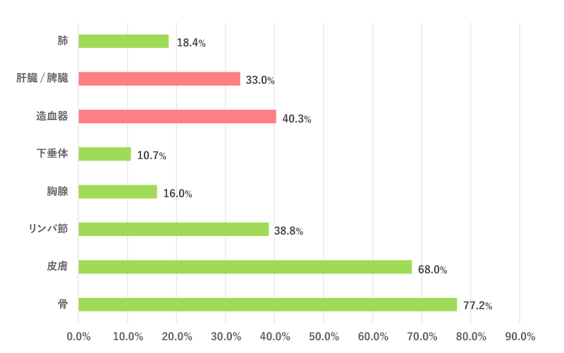 LCHが浸潤する臓器は多岐にわたるが頻度の高い臓器は「骨」・「皮膚」である(図4:JLSG-96/02試験に登録された小児LCHの病変部位)。LCHによる骨病変は溶骨性病変であり、病変の形成による軟部組織の腫脹と骨融解に伴い様々な臨床症状を呈する。骨病変は痛みを伴う事が多く、レントゲンでは溶骨を反映した” Punched-out lesion”を示す。その他、骨破壊に伴う中耳炎、歯牙脱落、骨折、扁平椎や軟部腫瘤形成による眼球突出や脊髄圧迫症状などをきたす。皮膚病変は赤みの強い出血性丘疹や脂漏性湿疹が特徴的だが、多彩な皮疹を呈する。さらに、肝臓(肝腫大)、脾臓(脾腫大)、造血器(2系統以上の血球減少)は「リスク臓器」と呼ばれ、これらの臓器に浸潤のあるLCHは生命予後が不良であることが知られており注意が必要である。視床下部から下垂体部分の浸潤により、中枢性尿崩症を生ずる例がLCHの20%ほどにみられる。さらに下垂体前葉機能低下をきたす例もある。