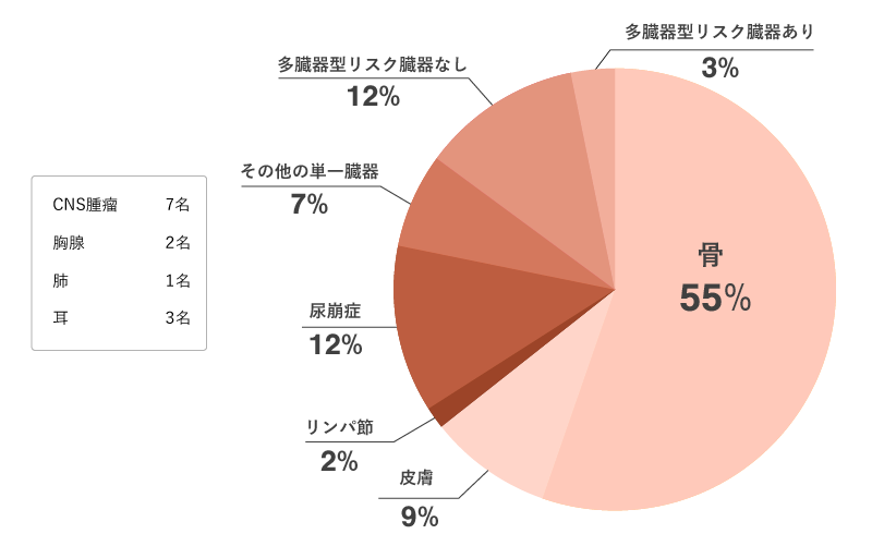 再発の病型は単一臓器型が85%と大半を占めており、多臓器型で再発したのは15%であり、リスク臓器への再発が認められたのは全体の3.2%であった。単一病変型の中で最も多かったのは骨再発55%であり、次いで尿崩症12%、皮膚9%であった(図5)。