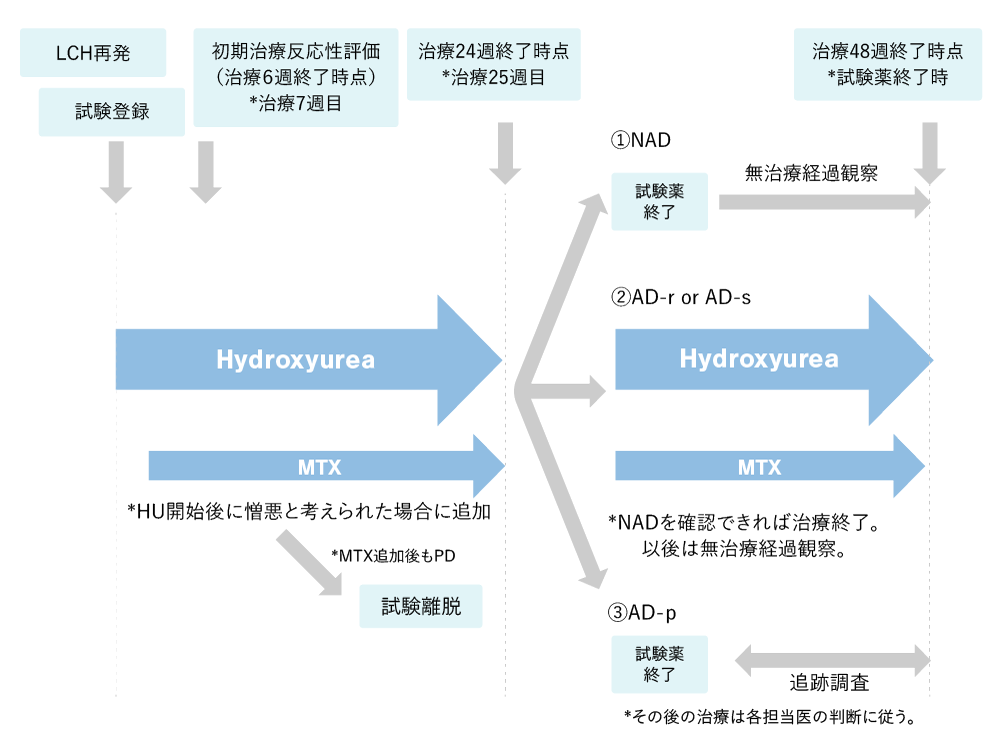 本試験登録後2週間以内にHU(ハイドロキシウレア)を開始する。HU投与開始をWeek1(day1)として投与を開始し、Week24まで継続する。HU開始後にLCH病変の増悪が認められた場合はMTX(メトトレキサート)の併用を開始する。MTXを併用した場合は、HU投与を継続している限り原則として投与を継続する。